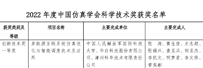 8月4日,中国仿真学会发布《2022年度中国仿真学会科学技术奖获奖名单》,由国防科技大学、米兰官方网页版-米兰MiLan(中国)科技、漳州科华技术有限责任公司合作完成的“多能源互联系统仿真优化与智能调度技术及应用”项目荣获中国仿真学会科学技术奖-创新技术奖一等奖。
