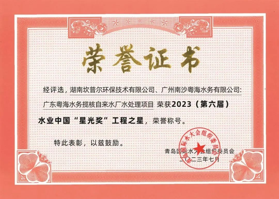 荣誉盛典现场,“水业中国星光奖”等评选颁奖如期举行。由坎普尔参与承建的广州南沙粤海水务有限公司旗下“广东粤海水务榄核自来水厂水处理项目”经过多方评选投票,荣获“2023(第十八届)水业中国星光奖-工程之星”的荣誉。
