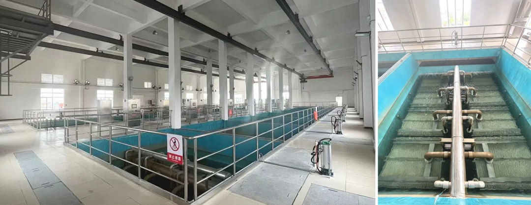 参评项目隶属广州市南沙区榄核自来水厂及配套管网扩建项目,采用清水池叠池加浸没式超滤膜池深度处理技术。项目共设14个浸没式超滤膜池,每个膜池独立产水,超滤系统总产水能力达到15万吨/天。选用10976帘坎普尔SVS-2580浸没式超滤膜组件,净通量25LMH,过滤方式采用重力式过滤,大大降低了运行能耗。沉淀池出水经超滤处理后产水可以保证浊度<0.1NTU。该项目肩负着整个南沙新区日益增长的用水需求,是广州市南沙区重点民心工程、惠民工程。