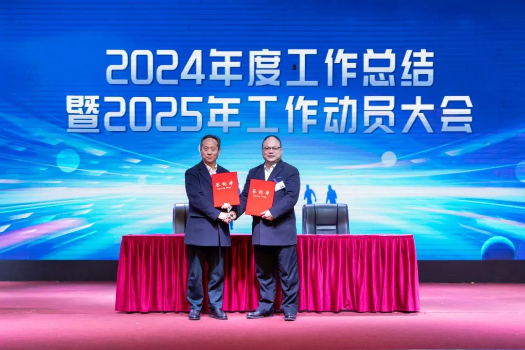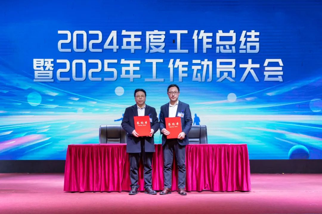 财务总监陈红飞宣读2025年度公司总预算及各单位预算目标,相关高层干部现场接受预算下达;总裁佘朋鲋宣读高层干部管理岗位任职目标承诺2024年度完成情况、2025年度任职目标承诺难度等级评定情况,并与干部代表现场签订任职目标承诺书。
