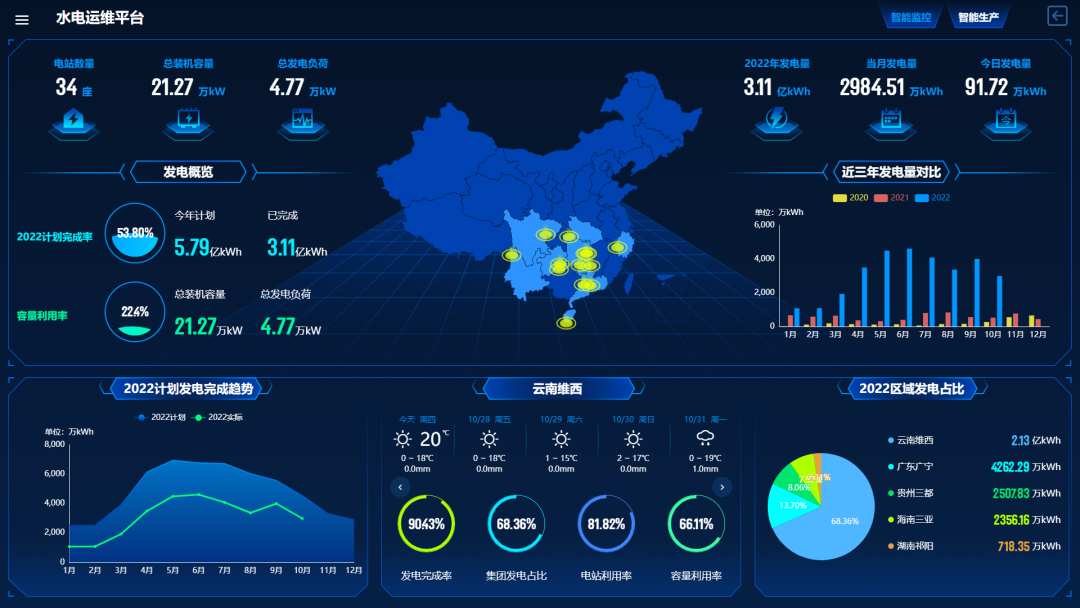 公司通过整合运行管理历史、人工经验,构建“在线监视、远程控制、运维智能、人机协同”的全新生产组织形态与管理模式,建设多能物联智能运维平台,采取总部、区域、现地三级管控,通过“以点带片”、“分片管理”的模式建立区域运维中心,构建智能监控子平台、运维管理子平台、生态流量及安全生产监管子平台等,上下联动、层层穿透,权责清晰,实现电站群远程中央监控、集约化联合调度及梯级电站优化调度,有效解决水电站问题难发现、数据难分析、运行难监管等问题,提升管理水平,保障生产安全。