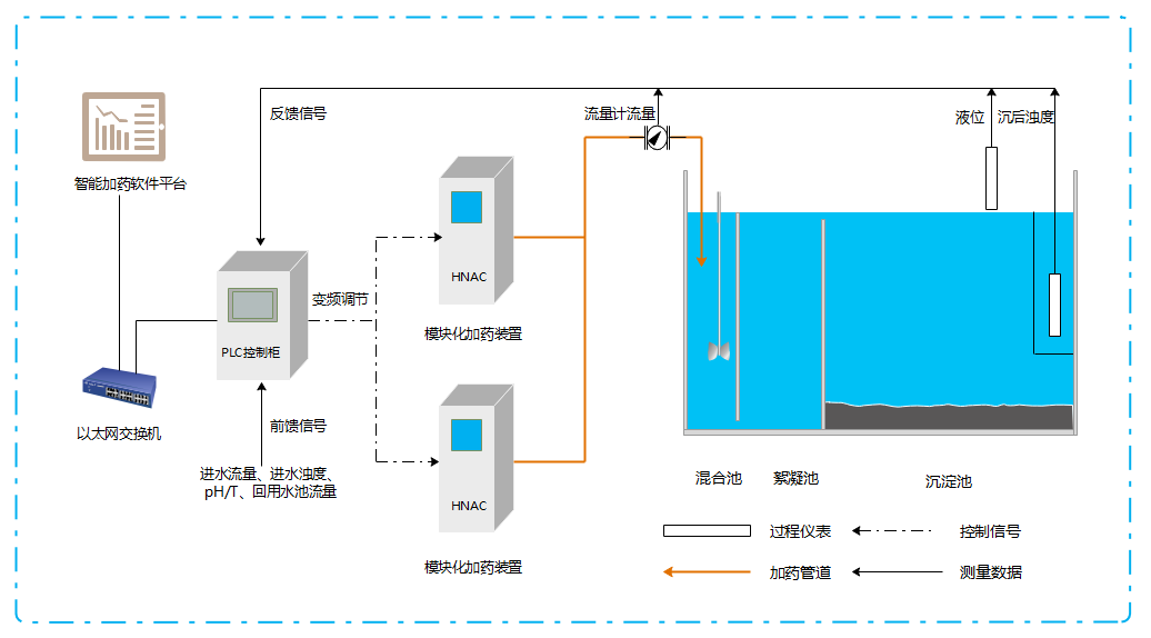 智能加药系统主要是由加药设备及仪表、自控系统、智能控制器和软件算法平台组成,可实现自来水处理过程中的絮凝沉淀工艺段加矾设备选型设计、自动化控制、药剂精确投加及状态实时监控等功能。