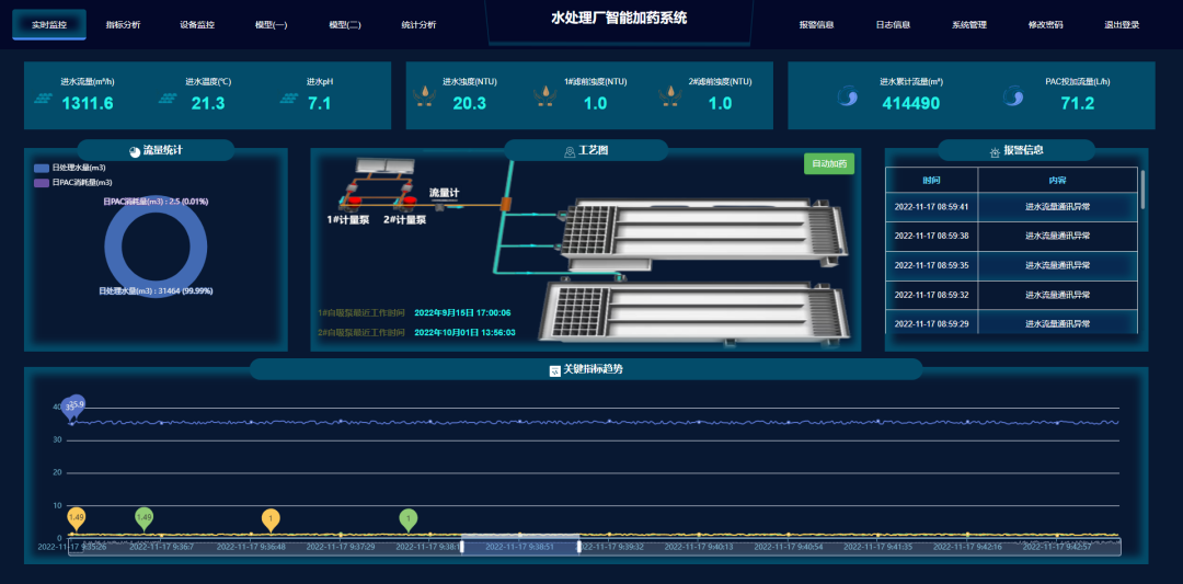 智能加药系统可通过软件平台对工艺过程进行全自动监控、诊断、仿真以及人机交互,从配药到投药全程自动化控制,设备故障自动进行切换控制;实现对设备运行、药剂消耗、水质监控等方面进行实时诊断、数据分析、故障预测及报警,达到水厂加药系统的无人值守运行。