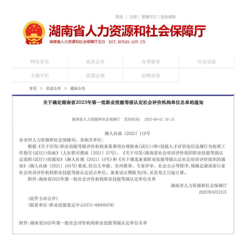 近日,湖南省人力资源和社会保障厅印发《关于确定湖南省2023年第一批职业技能等级认定社会评价机构单位名单的通知》,米兰官方网页版-米兰MiLan(中国) 等51家单位经专家评审确定具备职业技能等级认定社会评价资格。公司职业技能工作再上新台阶,可面向社会开展指定职业(工种)职业技能等级认定工作。