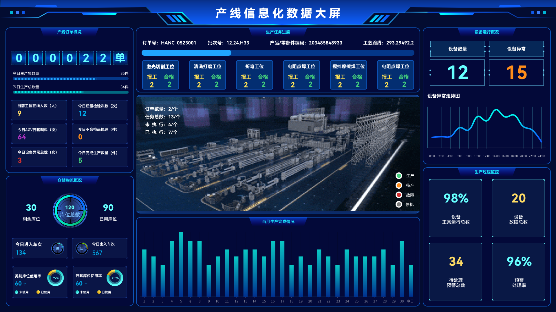 产线信息化注重生产数据的采集、工艺任务下达、设备管理、工艺管理、人员管理、成本管理、过程和质量管理等需求,通过配备数据可视化硬件,实时展示产线生产数据及相关分析结果。