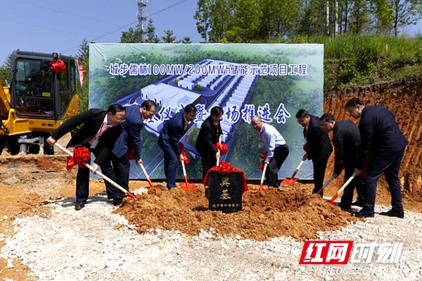 伴随着礼炮和掌声,城步儒林100MW/200MWh储能示范项目工程正式开工,领导和嘉宾们一起为项目开工奠基培土。